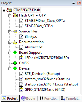 Open the example project in MDK (the web page explains how to do this). The µVision Project window should display a similar project structure:
