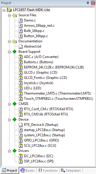 Open the example project in MDK (the web page explains how to do this). The µVision Project window should display a similar project structure: